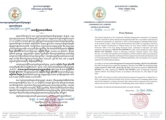 AKP Phnom Penh, April 3, 2026 — Commercial Gambling Management Commission of Cambodia (CGMC) has revoked the licence of SHANG HAI RESORT Co., Ltd. after authorities uncovered online scam activities during a joint inspection operation in Svay Rieng province. According to a press release i...