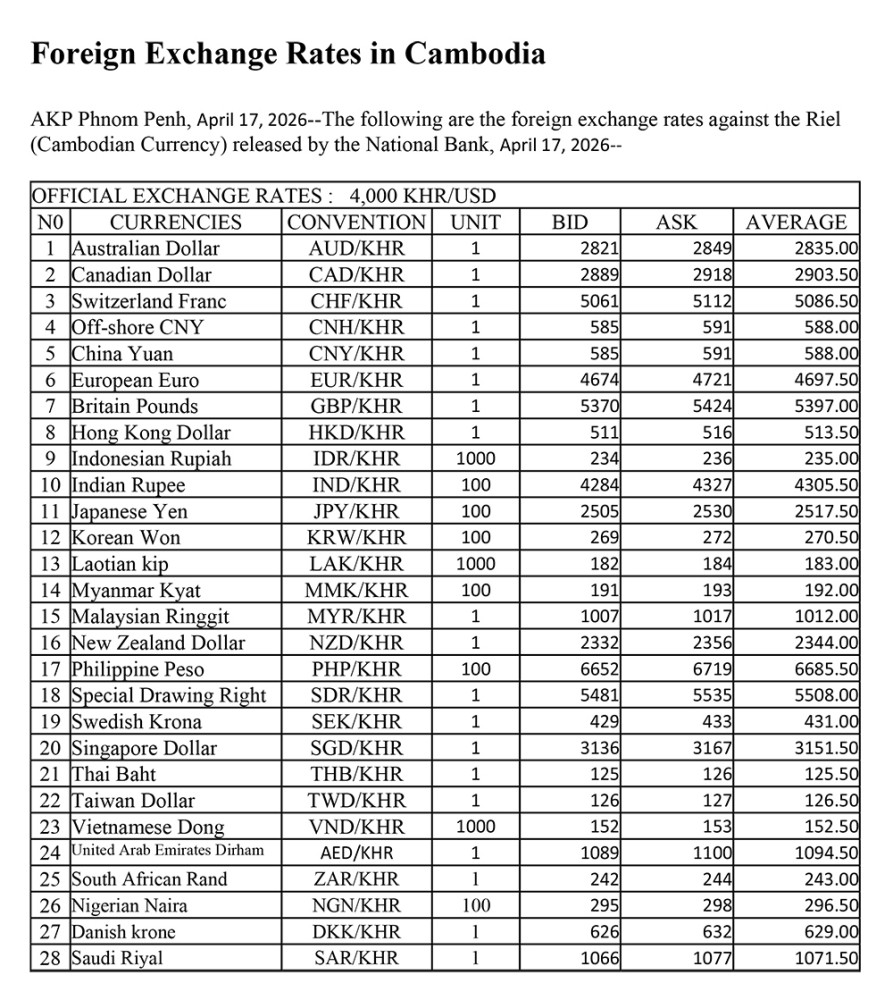 AKP Phnom Penh, April 17, 2026--The following are the foreign exchange rates against the Riel (Cambodian Currency) released by the National Bank, April 17, 2026--