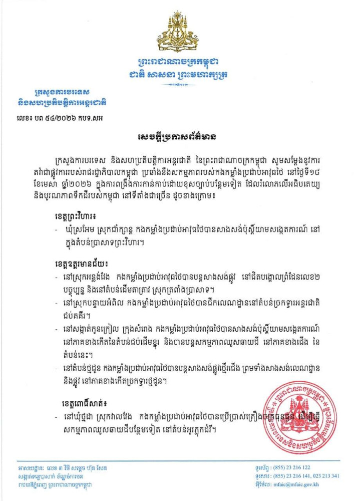 Cambodia’s Ministry of Foreign Affairs and International Cooperation has issued a formal protest against new activities by Thai armed forces aimed at consolidating an illegal occupation in violation of Cambodia’s sovereignty and territorial integrity.